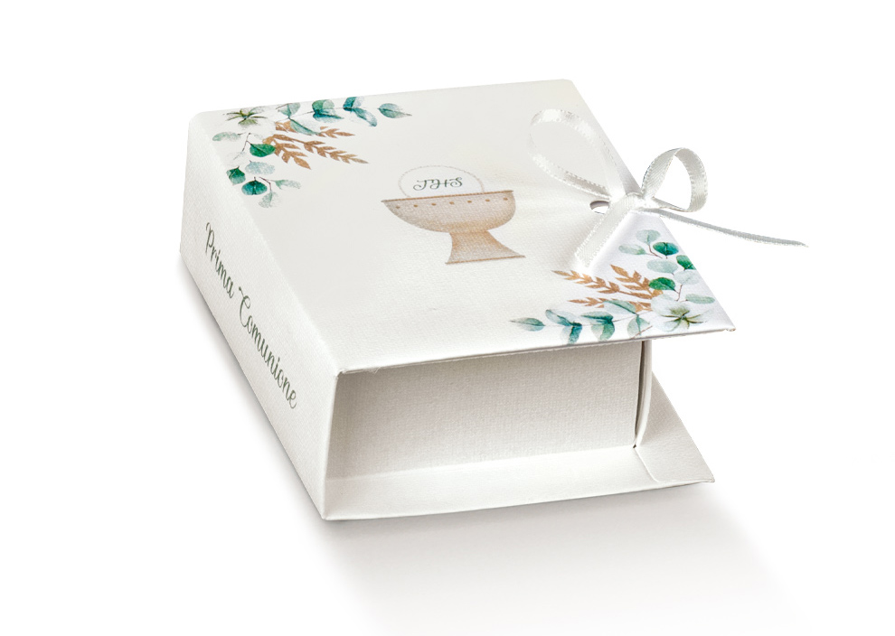 Scatola in cartoncino teso per confezionare confetti, piccoli oggetti. E’ provvista di fori che permettono la legatura con nastro.
