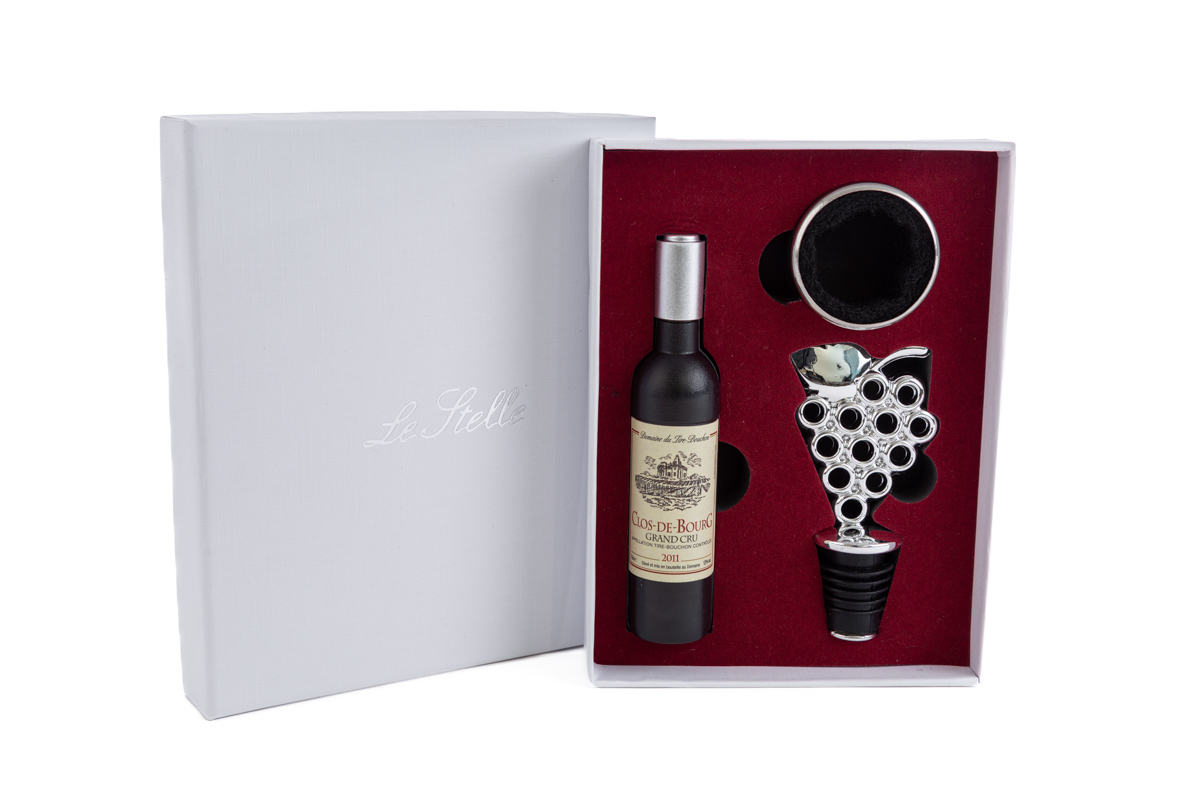 Set 3 pz. accessori vino, corredato con astuccio fondo e coperchio.