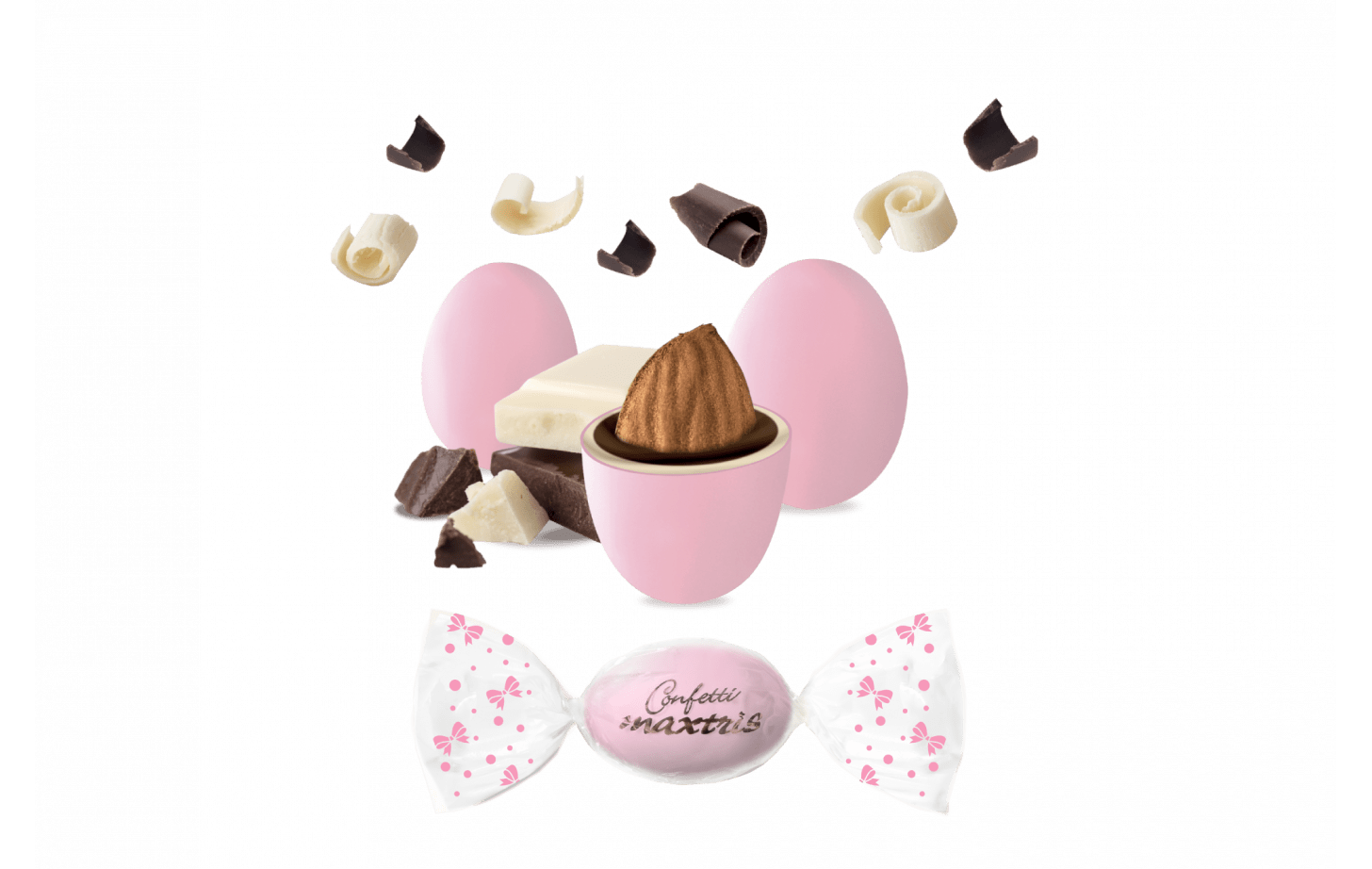 Cioccolato bianco (40%) (zucchero, latte intero in polvere, burro di cacao. Emulsionante: lecitina di soia. Aroma naturale di vaniglia), zucchero, cioccolato fondente (19%) (zucchero, pasta di cacao, burro di cacao. Emulsionante: lecitina di soia. Aroma naturale di vaniglia), mandorle tostate (18%), maltodestrina. Coloranti: E171, E120. Agenti di rivestimento: cera carnauba (E903), cera d’api (E901). Può contenere nocciole, noci, noci di pecan, noci di acagiù (o anacardi), pistacchi e arachidi.