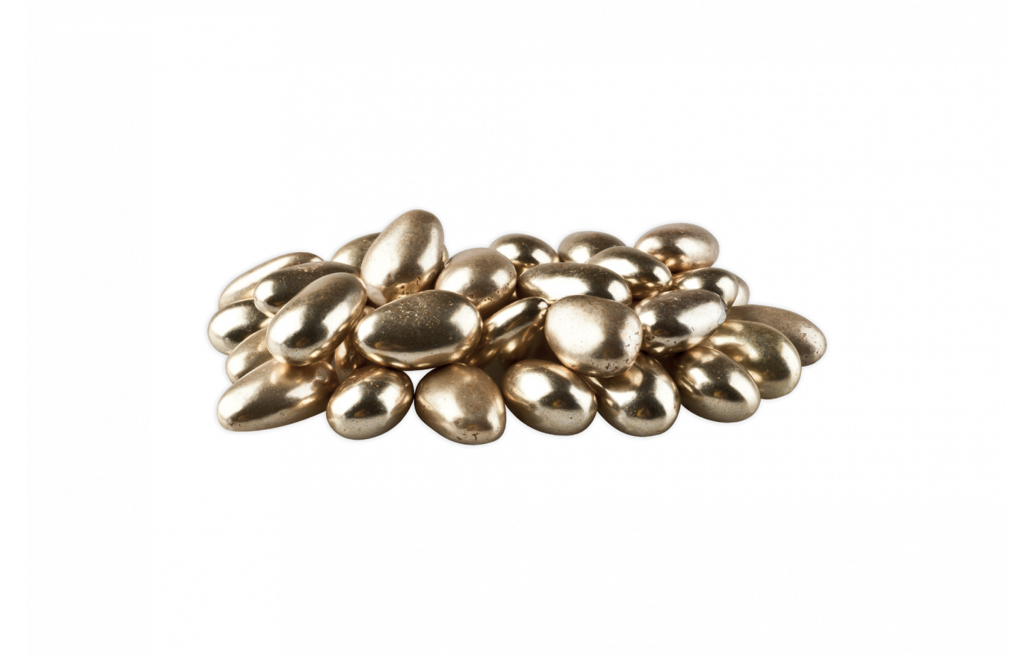 Zucchero, cioccolato fondente (45%) (zucchero, burro di cacao, pasta di cacao. Emulsionante: lecitina di soia. Aroma naturale di vaniglia), amido, maltodestrina. Agenti di rivestimento: cera carnauba (E903), cera d’api (E901). Coloranti: se oro (E174, E104*, E122*), se argento (E174). (*) può influire negativamente sull’attività e l’attenzione dei bambini. Può contenere latte e prodotti a base di latte (incluso lattosio), mandorle, nocciole, noci, noci di pecan, noci di acagiù (o anacardi), pistacchi e arachidi.
