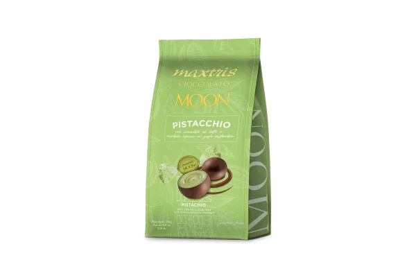 Cioccolato al latte (50%) (zucchero, burro di cacao, latte intero in polvere, pasta di cacao, emulsionante: lecitina di soia, aroma naturale di vaniglia), ripieno al cioccolato bianco al pistacchio (50%) (cioccolato bianco (34%) (latte intero in polvere, burro di cacao, siero di latte in polvere, latte scremato in polvere, destrosio, emulsionante: lecitina di soia, aroma naturale di vaniglia), grasso vegetale (palmisti, palma, girasole, colza) in proporzione variabile, zucchero, pasta di pistacchio (5%) (pistacchi (99,3%), clorofilla, curcumina), destrosio, aroma).