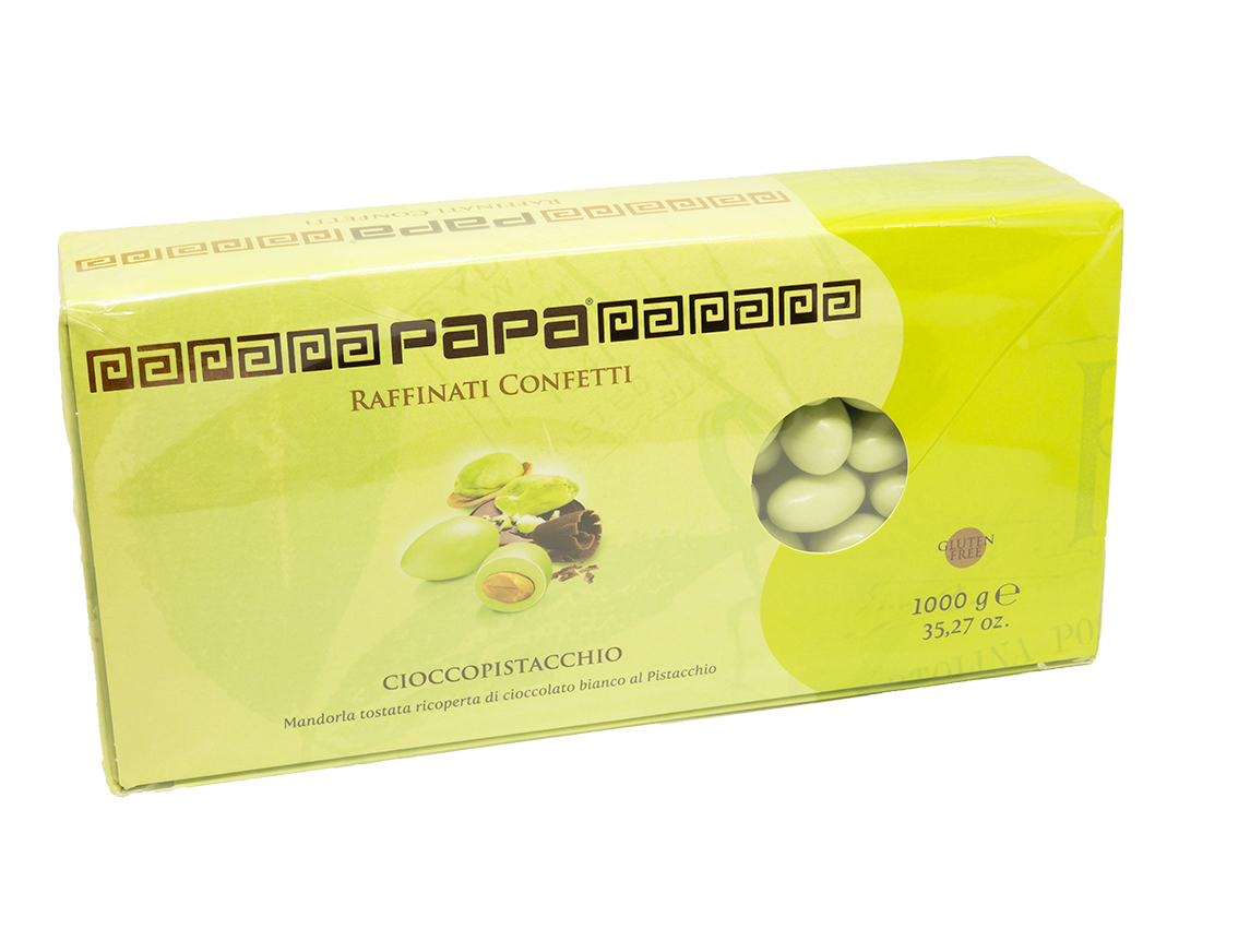 Confetti con mandorla tostata al gusto di Pistacchio. Senza Glutine e con vera frutta. Confezione da gr.500 e da gr. 1000