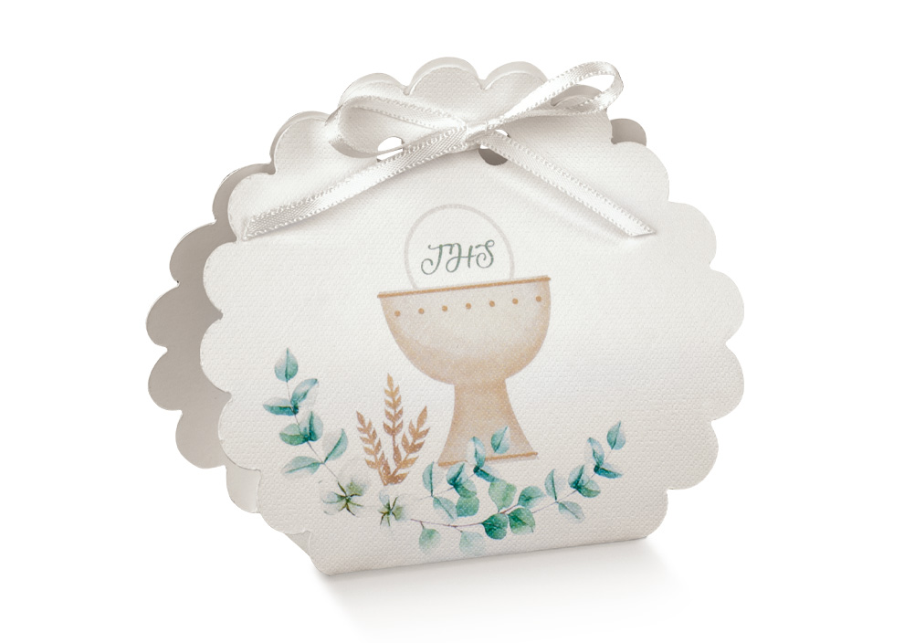 Scatola in cartoncino teso, con sagoma a conchiglia bifacciale, per confezionare confetti, piccoli oggetti. E’ provvista di fori per la legatura con nastro.